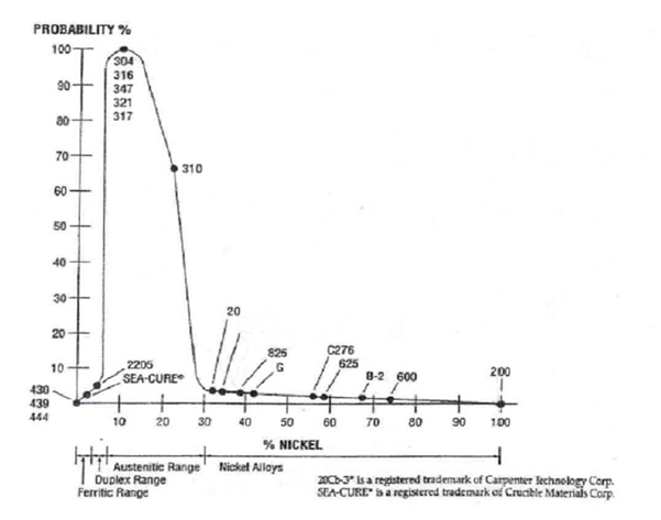 當我們考慮特殊合金中的氯化物誘導的SCC時,鎳含量是影響合金敏感性的主要因素。以下曲線根據(jù)合金的鎳含量,表明該合金開裂的可能性。