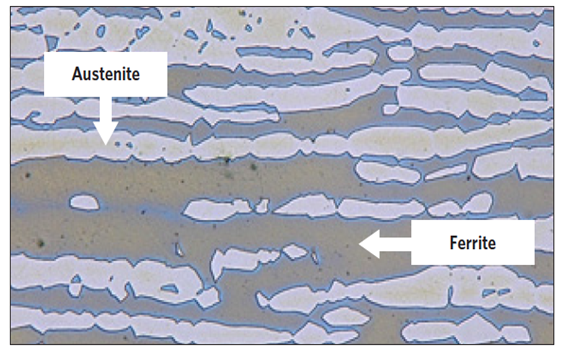 幾乎沒有鎳的碳鋼和鐵素體不銹鋼都不會經(jīng)歷Cl-SCC,也不會經(jīng)歷高鎳合金(鎳含量超過30%的合金不易開裂)。雙相不銹鋼由于其顯微組織中的鐵素體(請參見下圖),因此具有相同的耐性。盡管奧氏體允許SCC,但鐵素體微結構在裂紋擴展之前將其固定。
