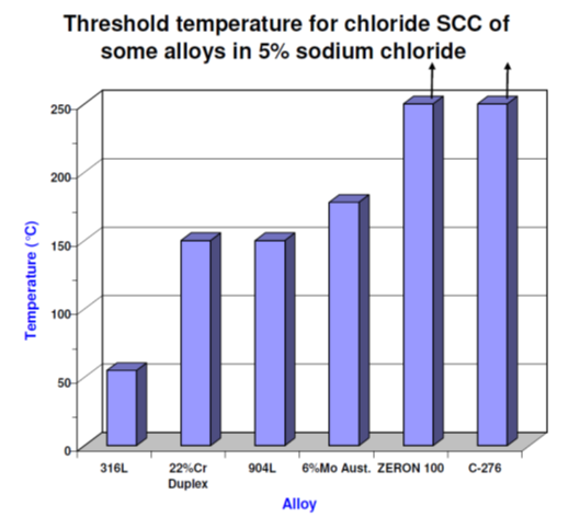 當氯化物濃度超過1000 ppm時,請勿使用316L。在非酸性環(huán)境中,22Cr(2205)雙相材料可以耐受高達8-10,000 ppm的氯化物含量。超級雙相材料(例如我們的Zeron?100)和超級奧氏體合金(例如軋制合金的AL-6XN?)可用于氯化物含量高達50,000 ppm的環(huán)境中。超級雙相不銹鋼和超級奧氏體不銹鋼被認為實際上不受氯離子應力開裂的影響。