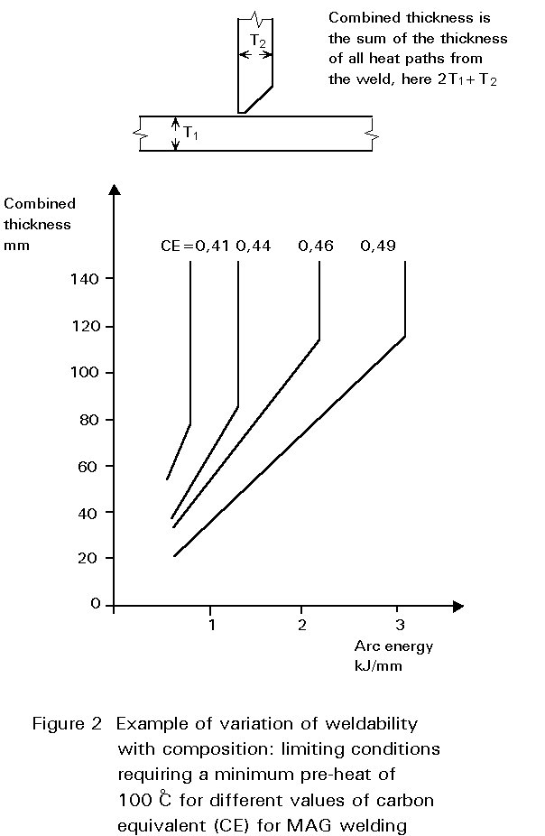 圖 2 顯示了成分對可焊性的影響。冷卻速率會增加冷裂紋的敏感性,并且受遠(yuǎn)離焊縫的熱路徑的組合厚度(圖中的垂直軸)控制。圖中的橫軸電弧能量也影響冷卻速度;熱量輸入越高,冷卻所需的時間就越長。該圖顯示了降低碳當(dāng)量如何增加可以在特定預(yù)熱條件下焊接的條件范圍,在此示例中為 100°C,在此示例中為使用傳統(tǒng)焊絲的 MAG 特定焊接工藝。
